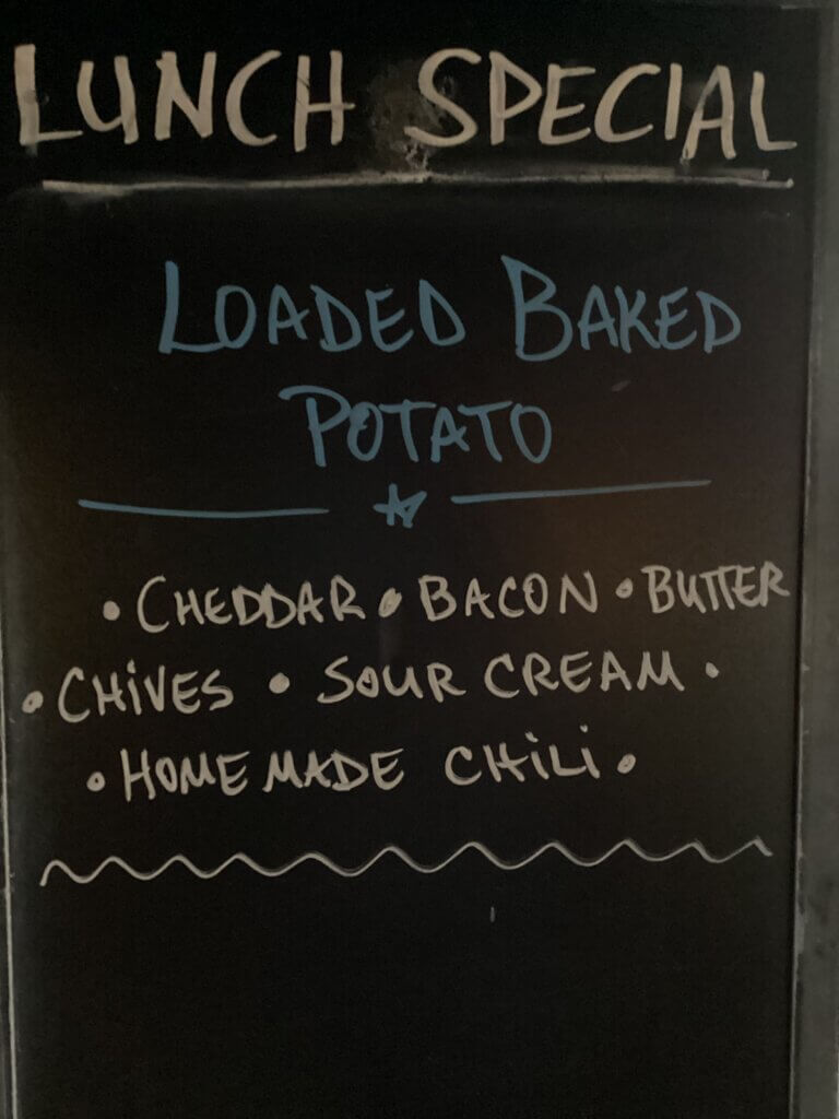 Lunch Special ~ Loaded Baked Potato Posted on January 21, 2026January 21, 2026 by cafejava Hours of Operation: Mon. – Thurs. 7:30am – 2pm; Fridays 7:30am – 11am Homemade Soup of the Day ~ Chicken Corn Chowder
